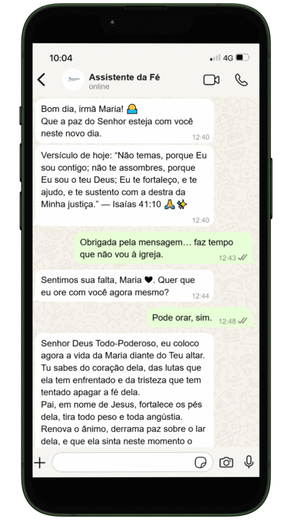 A Assistente da Fé envia versículos, orações e lembretes pelo WhatsApp todos os dias.